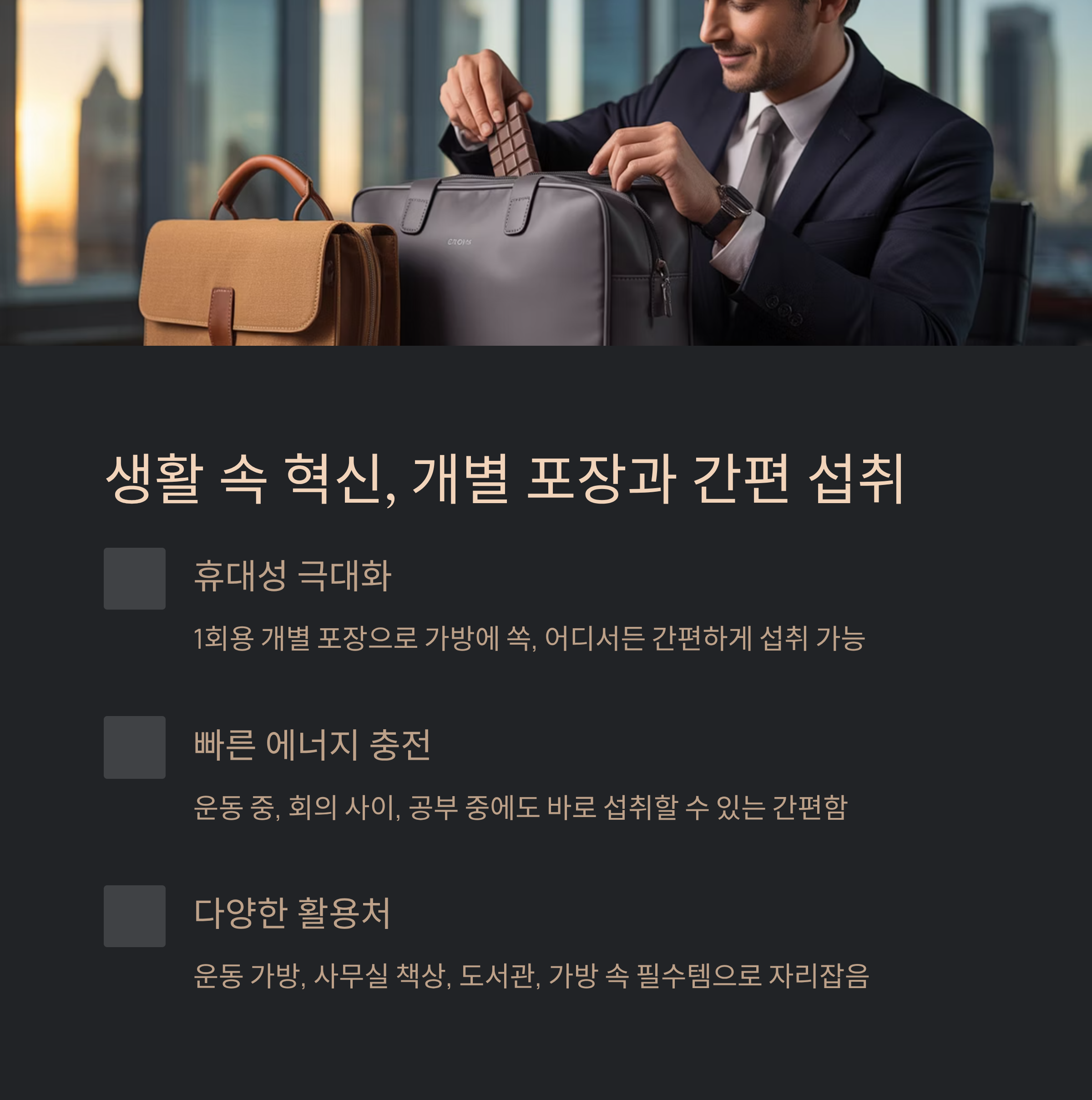 - 개별 포장 및 휴대성 강화 - 언제 어디서든 쉽게 섭취 가능
