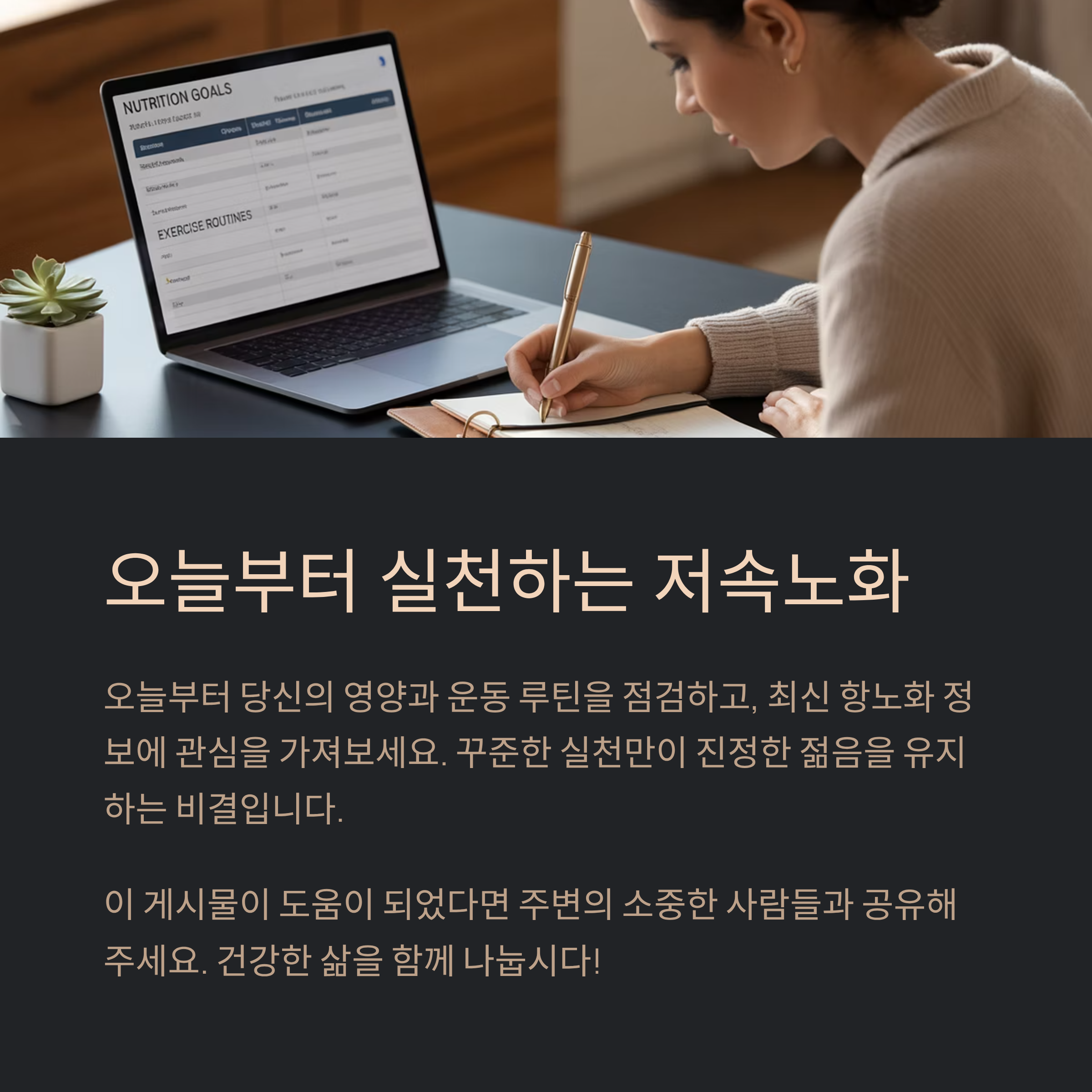 저속노화는 단지 노화를 늦추는 것이 아니라 건강 상태를 최상의 상태로 유지하는 데 있습니다. 오늘 다룬 다양한 전략과 기술은 이를 실천하는 데 유용한 도구들입니다. 이를 통해 우리는 더 크고 더 나은 변화를 느낄 수 있지요. 지금 바로 자신만의 저속노화 루틴을 시작해 보세요. 매일 조금씩의 변화가 장기적으로 큰 차이를 만들게 될 것입니다. 🌟