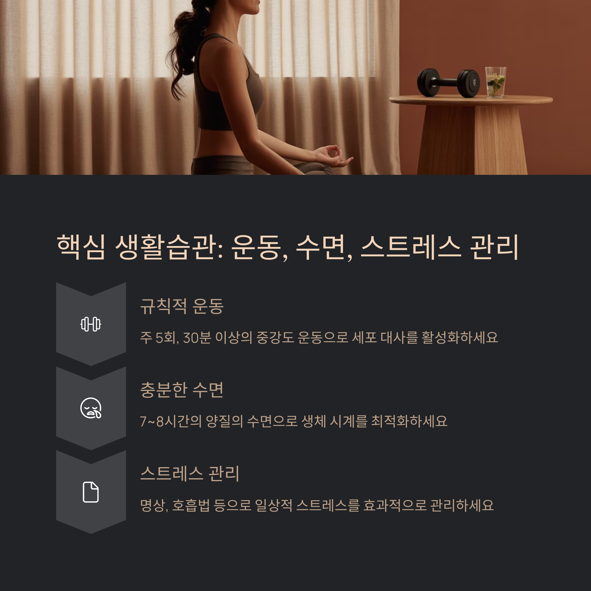 생활습관과 생활 환경의 변화는 저속노화에 큰 영향을 미칩니다. 특히 적절한 운동과 충분한 수면은 생물학적 나이를 건강하게 지켜주는 기본적인 요소들입니다. 중강도 이상의 유산소 운동을 주 150분 이상, 근력 운동을 주 2회 이상 꾸준히 실시하면 텔로미어 길이를 보호하여 노화를 늦추는 역할을 한다고 합니다. 이러한 생활습관을 통해 저속노화를 실천해보세요. 다음은 일상에서 쉽게 따라할 수 있는 체크리스트입니다.