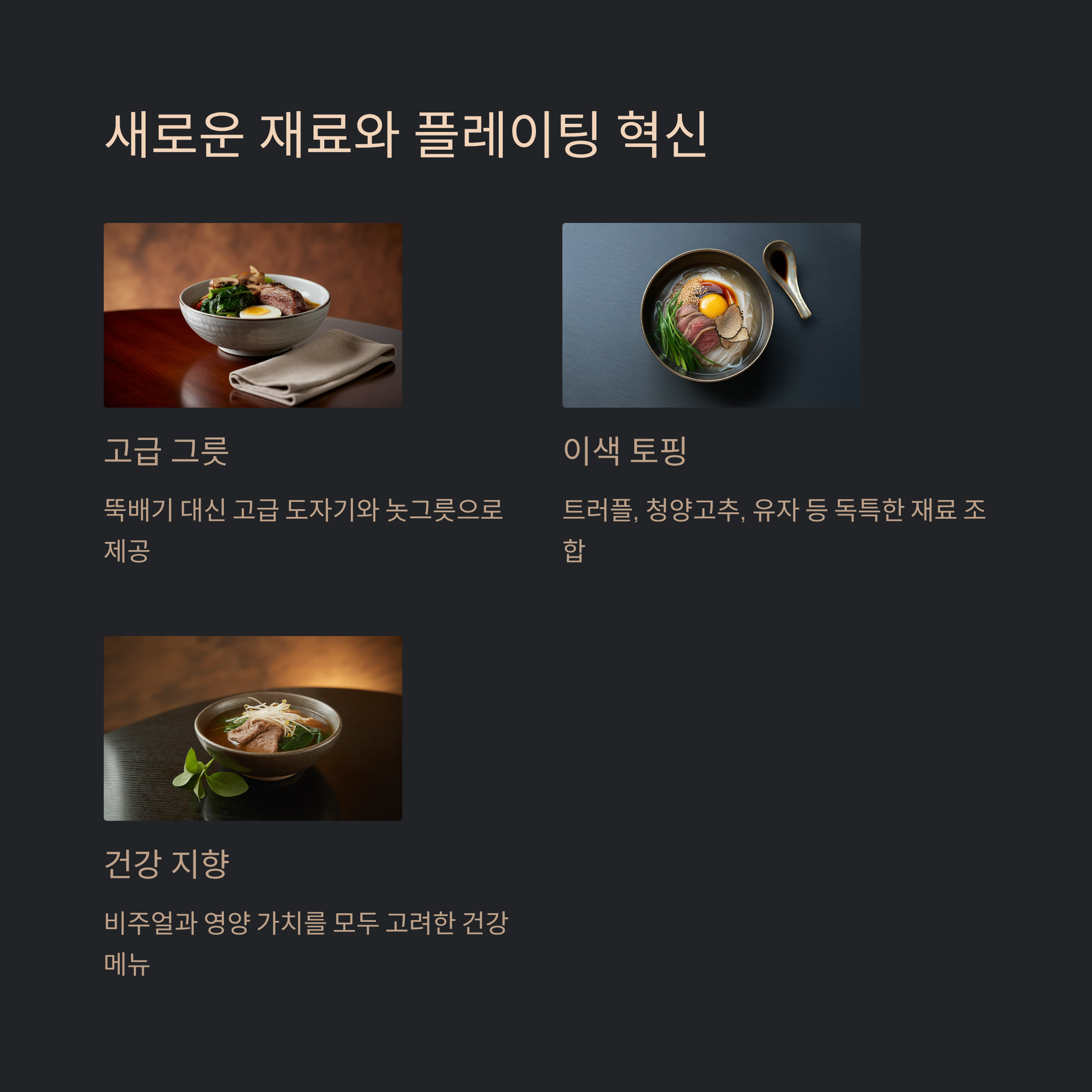 뉴웨이브 국밥은 고급스러운 재료와 창의적인 플레이팅이 주를 이룹니다. 전통적 국밥과의