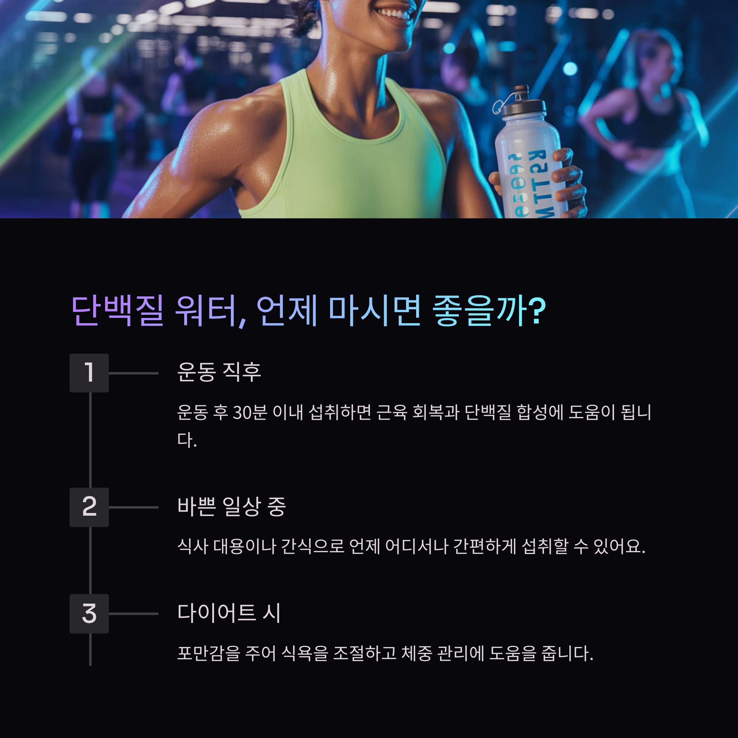 단백질 워터는 적절한 운동과 함께할 때 근육 회복과 형성에 도움을 줄 수 있습니다. 특히, 운동 후 30분 이내에 섭취하면 근육 손실을 최소화하고 회복을 촉진하는 데 도움을 줍니다. 하지만 단백질 워터 자체만으로는 큰 효과를 기대하기 어렵고, 꾸준한 운동과 영양 관리가 필수적입니다.