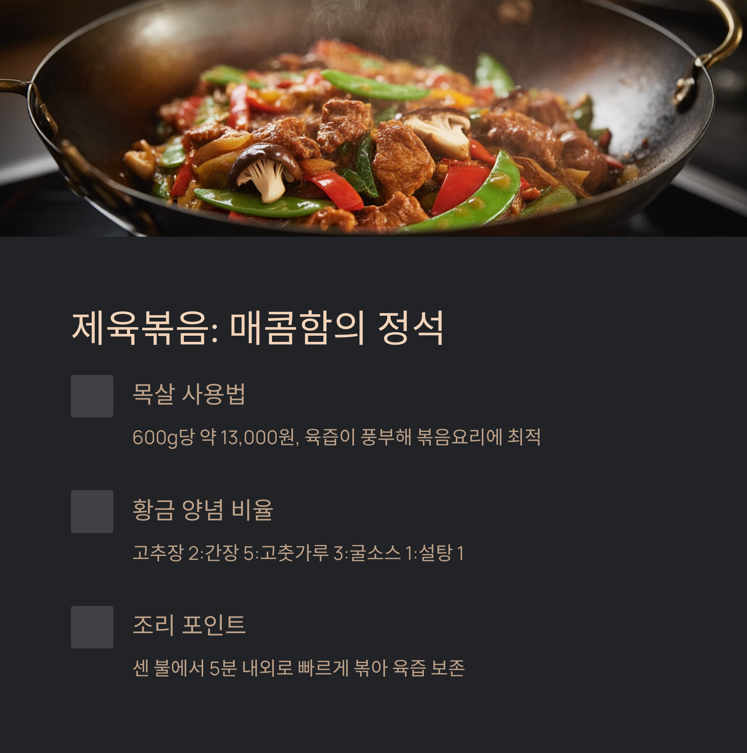 하실 수 있어요. 그런데 재밌는 사실은, 대부분의 사람들이 제육볶음을 인생 첫 돼지고기 요리로 시작한답니다.🤔