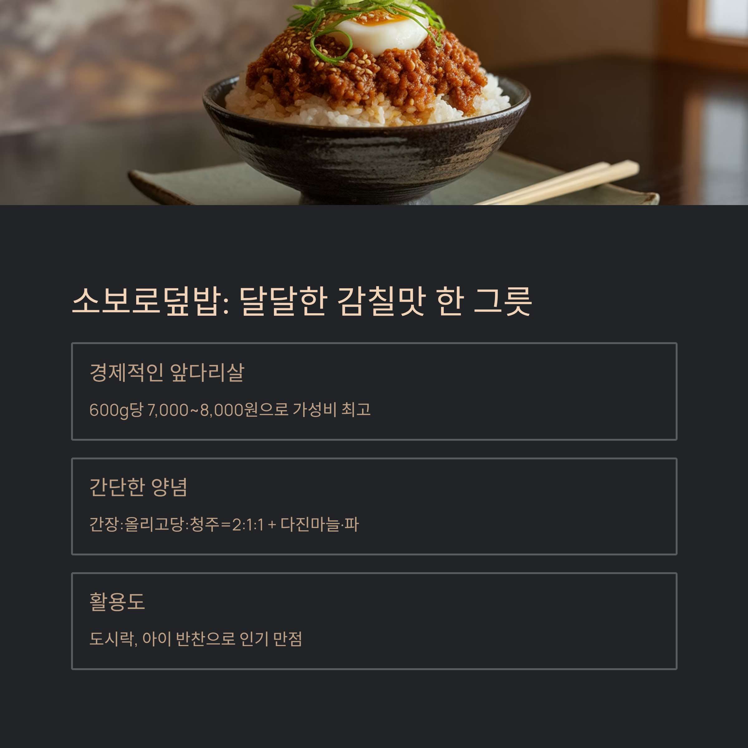 소보로덮밥은 요리 시간이 짧으면서도 맛있는 한 그릇으로 만족감을 줍니다. 다진 돼지고기를