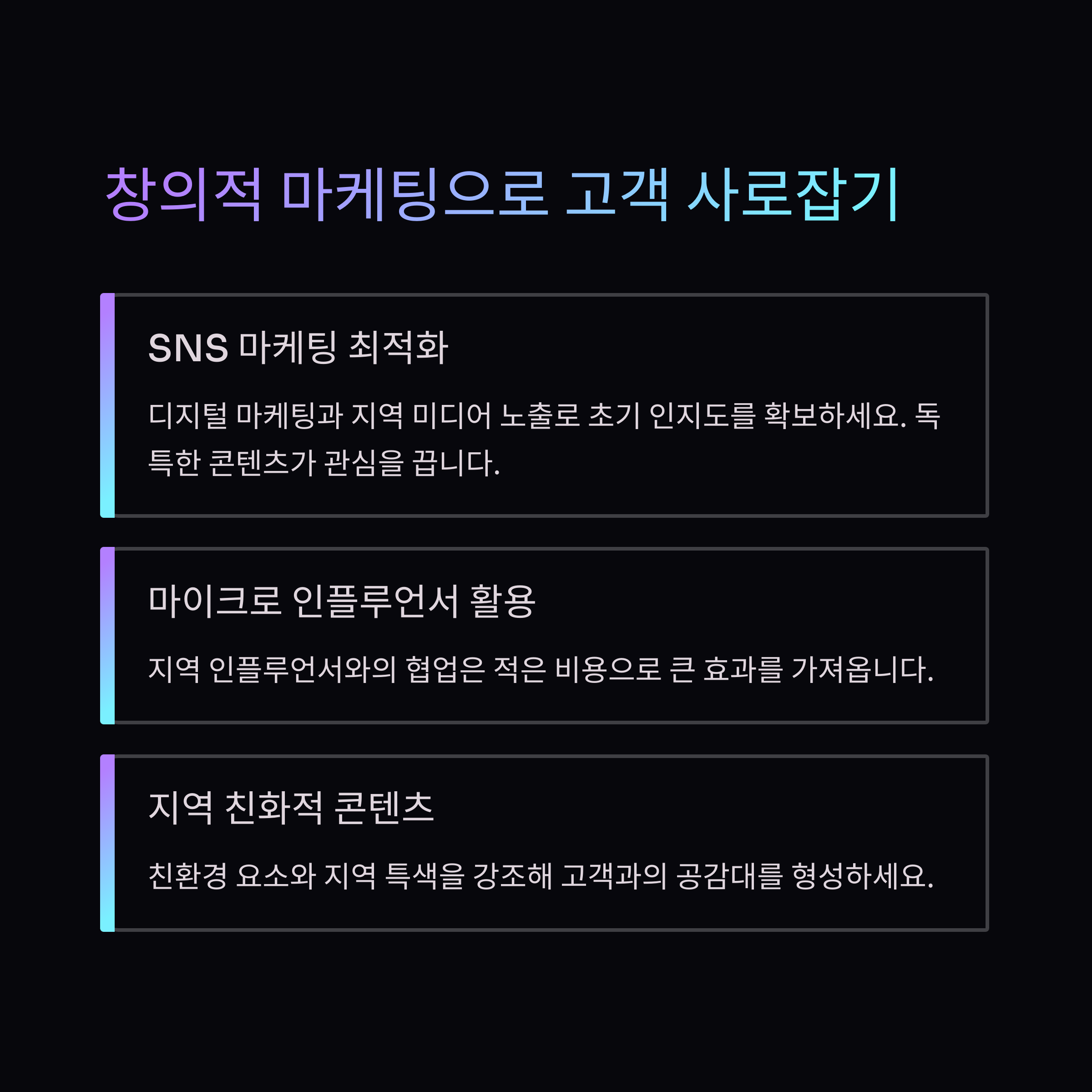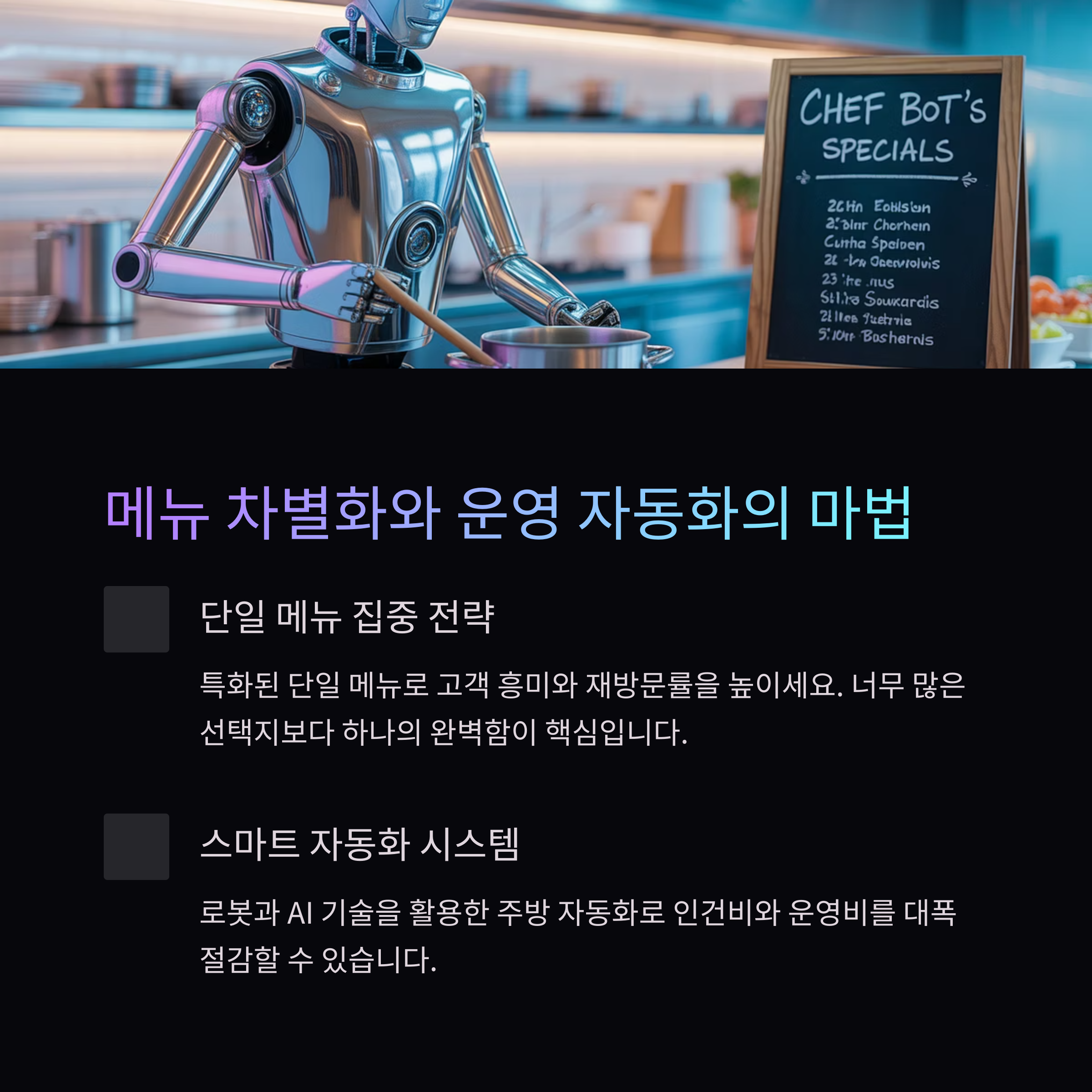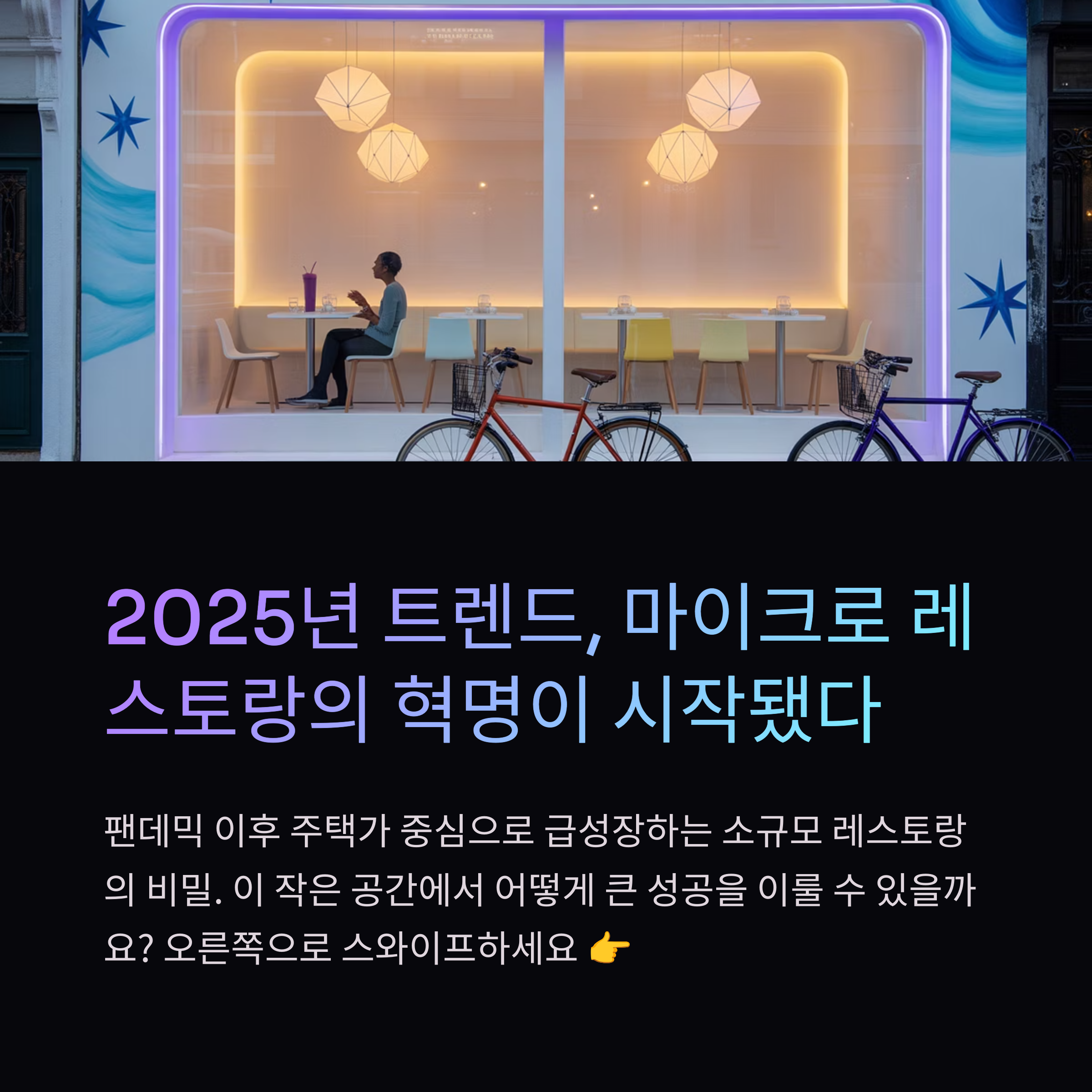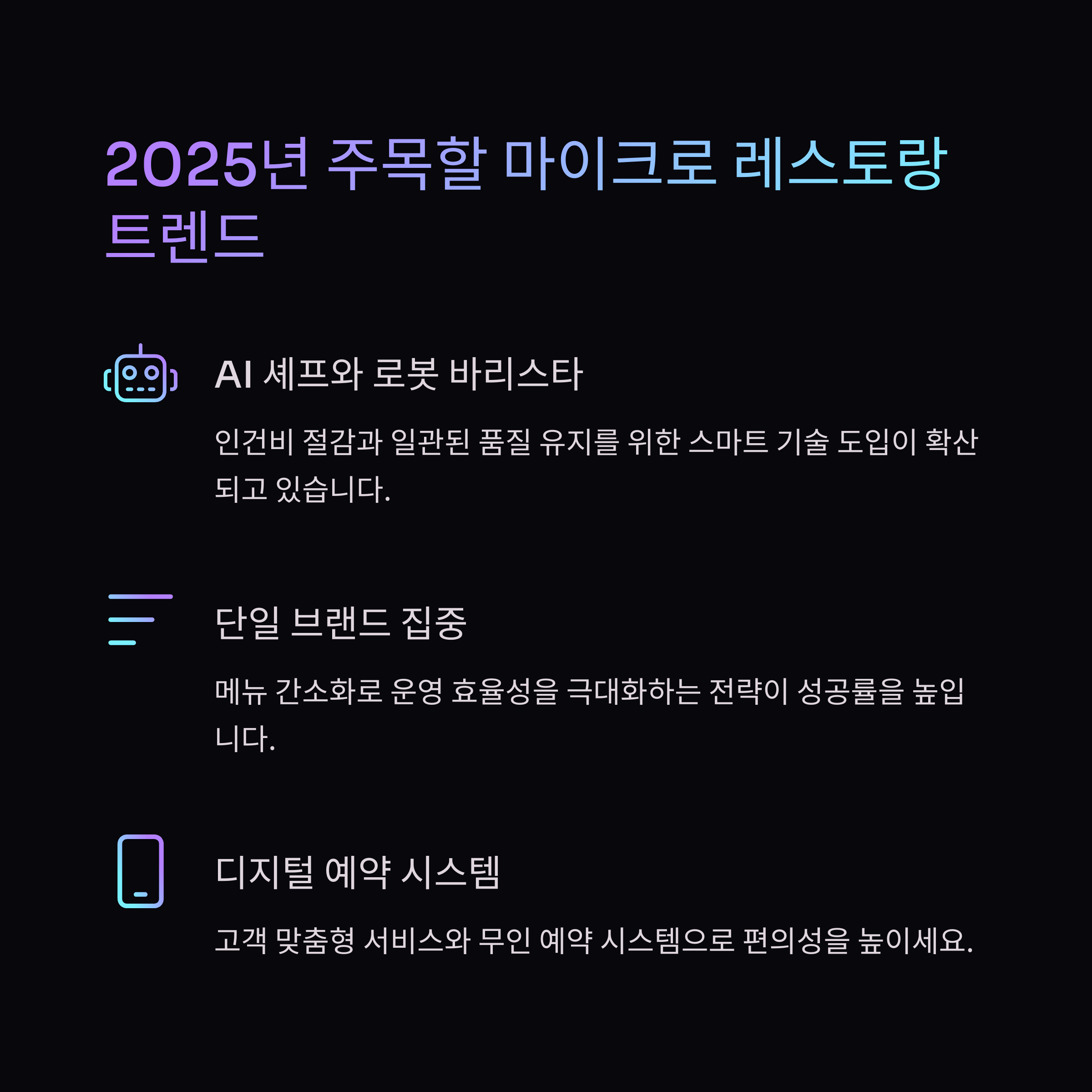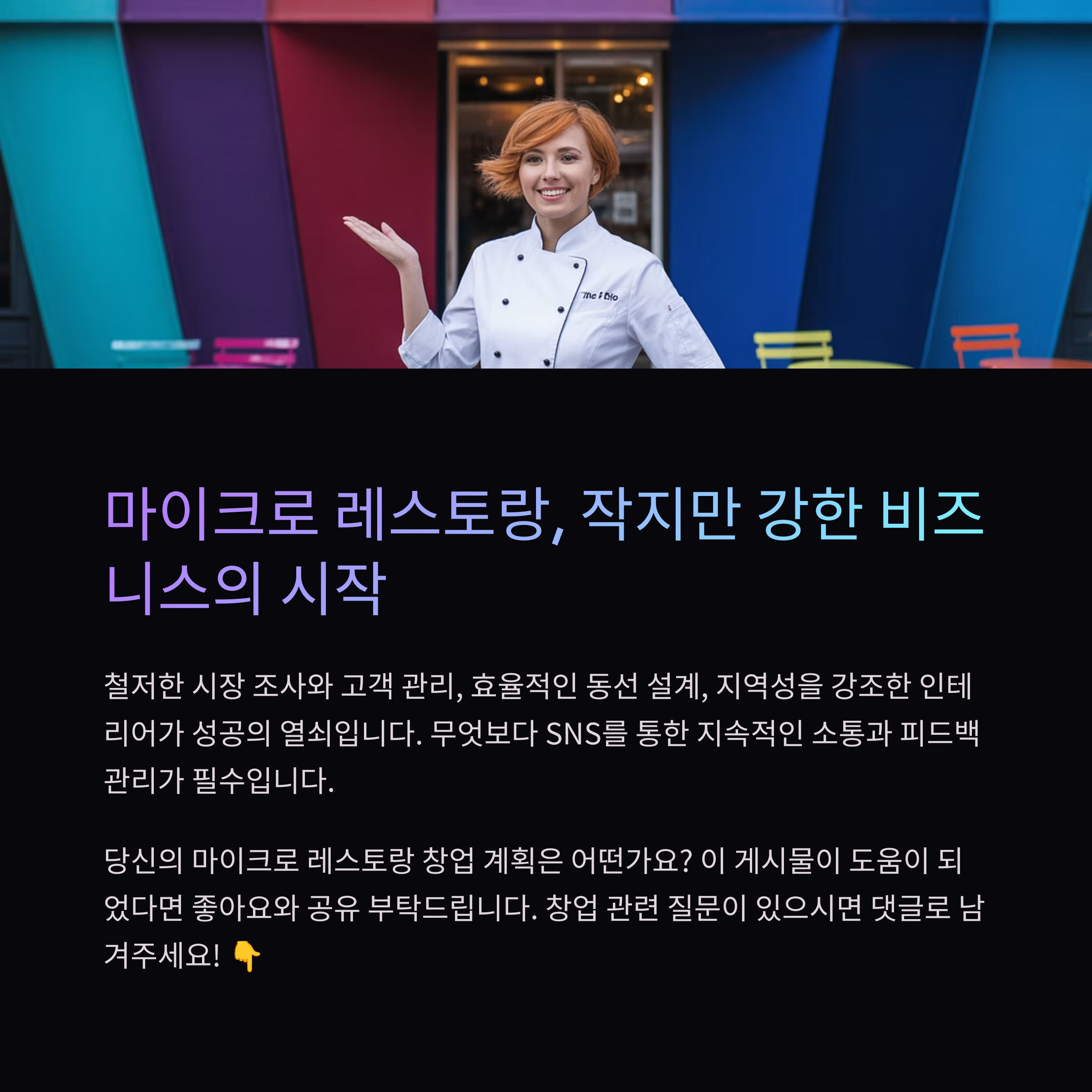 마이크로 레스토랑의 성공은 차별화된 메뉴와 뛰어난 운영 능력에서 나옵니다. 혁신적인 아이디어와 기술을 적극 활용하여 경쟁력을 높일 수 있습니다. 고객의 요구를 바탕으로 한 맞춤형 서비스와 지역성을 강화한 메뉴는 고객의 발길을 불러올 수 있습니다. 이 모든 노력들이 모여 한발 앞선 시장에서의 성공을 가능하게 합니다. 지속적인 관심과 노력으로, 작지만 강한 레스토랑을 운영할 수 있을 것입니다.
