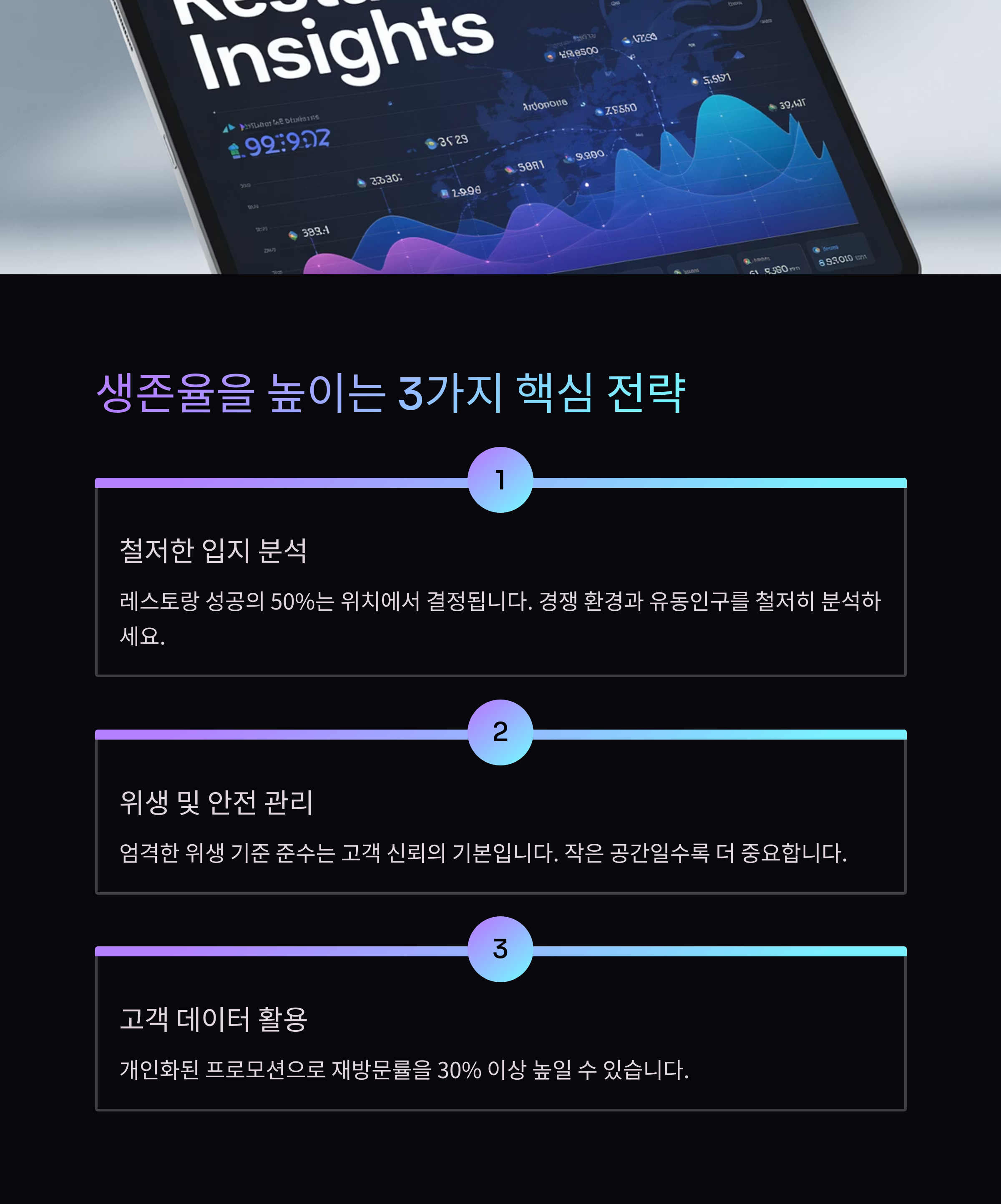 매출 향상 전략은 레스토랑의 성패를 좌우하는 중요한 요인입니다. 마이크로 레스토랑의 경우, 메뉴를 단순화하고 고객 만족도를 높이는 것이 중요합니다. 대표 메뉴 기준 2~3개만 운영해서 고객의 반응을 본 후, 반응이 좋은 메뉴를 확장하는 것이 좋습니다. 업셀링 시스템을 활용하여 모바일 및 키오스크 메뉴판을 통해 세트 구성 및 사이드를 활용하여 평균 매출을 높일 수 있습니다. 또한, 디지털 예약과 마케팅을 적극 활용해야 하며 인스타그램 및 네이버 앱을 통해 예약을 유도하고 프로모션 코드를 활용해 고객 유입을 극대화 할 수 있습니다. 이러한 마케팅 전략으로 고객 데이터 관리가 용이해지고, 특히 생일 특별 쿠폰이나 단골 할인 이벤트, 모바일 푸시 알림을 활용하여 고객의 재방문율을 높입니다. 이러한 전략적 접근으로 인당 객단가를 높여 매출 향상을 꾀할 수 있습니다.