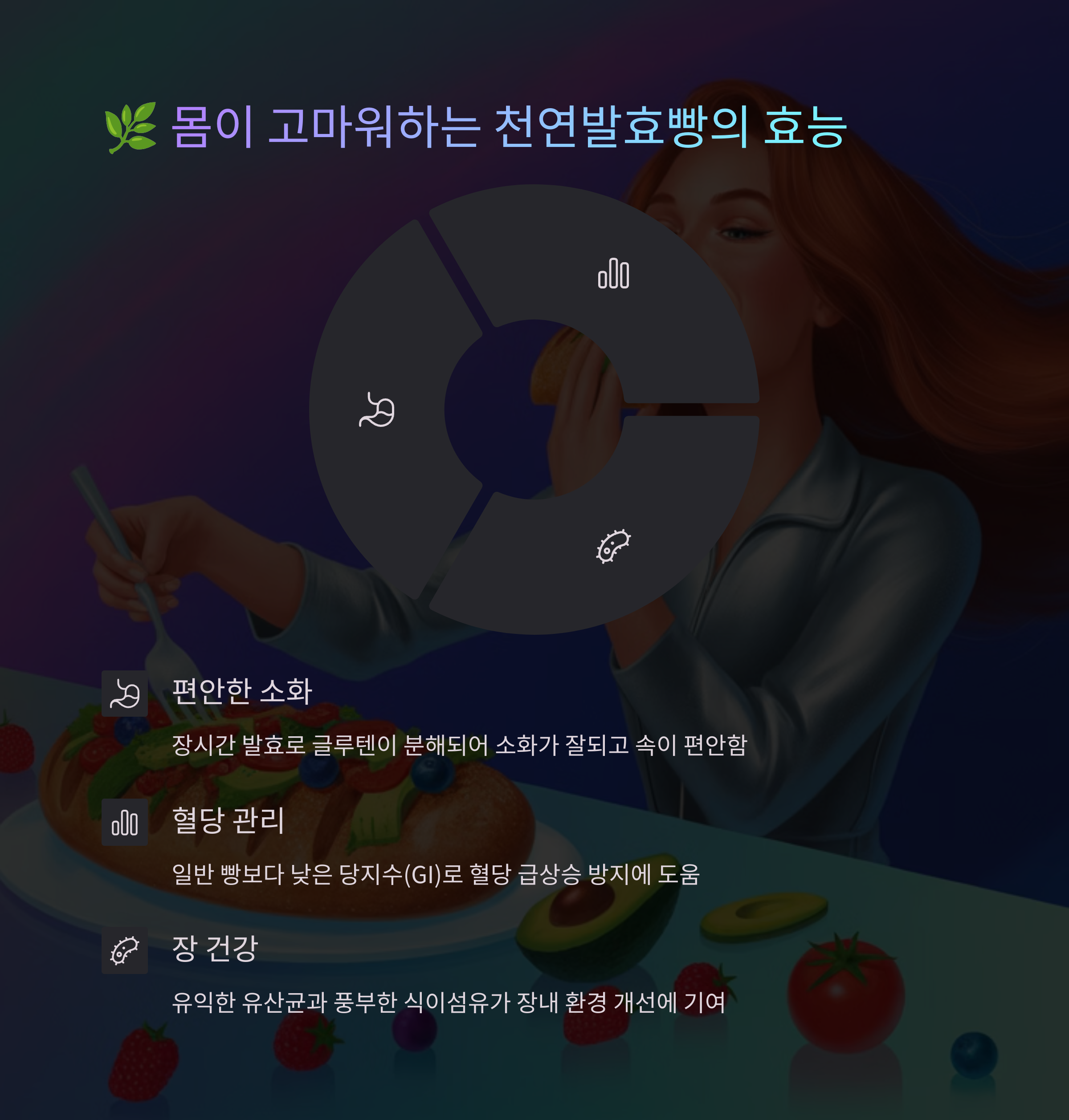 천연발효빵은 자연 발효균을 사용하여 만들어져 소화가 훨씬 용이합니다. 발효 과정에서 생성되는 유산균은 장 건강을 촉진하고, 혈당 상승을 낮추는 효과가 있습니다. 또한 글루텐 구조가 분해되어 글루텐 민감한 사람들도 비교적 안전하게 섭취할 수 있습니다.
