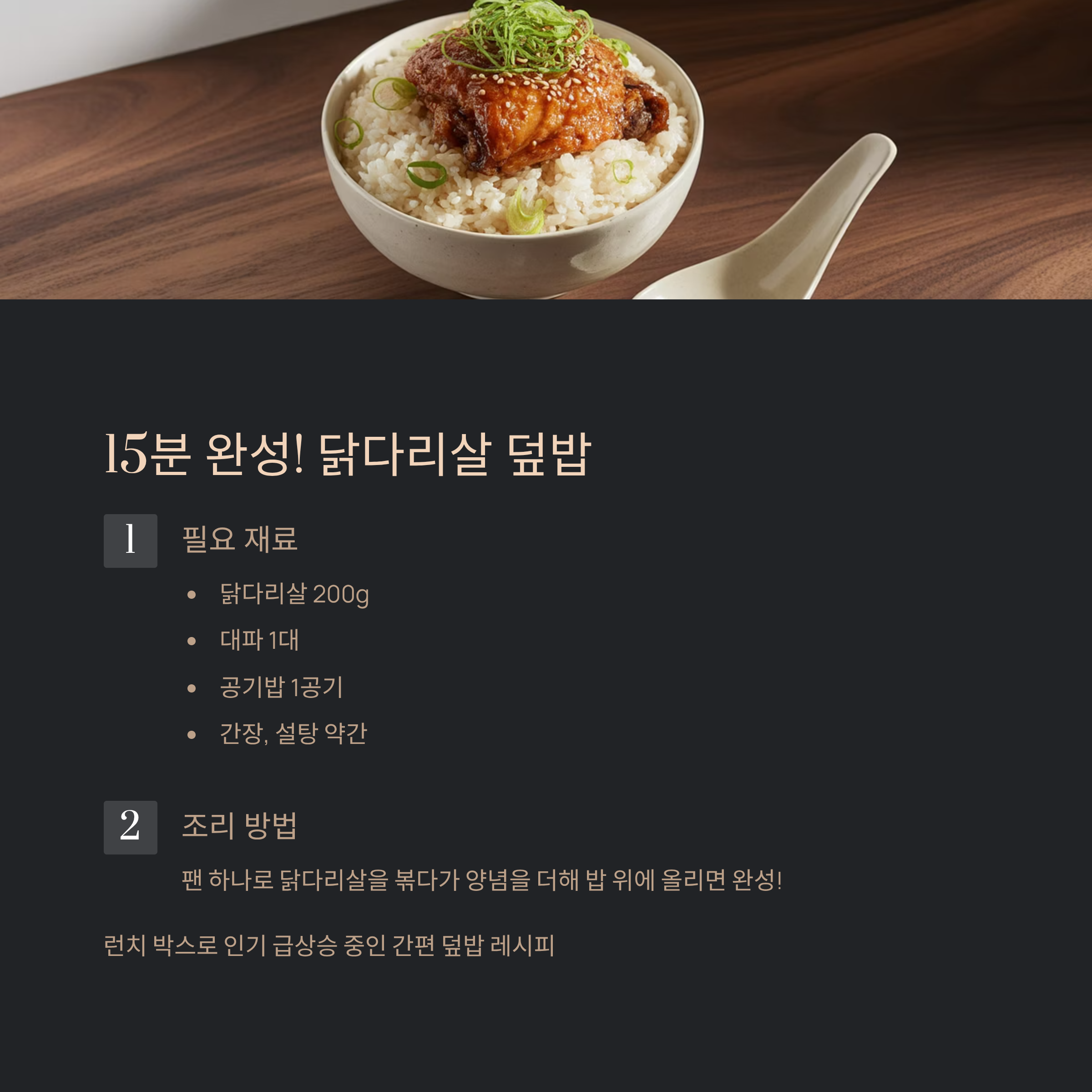 닭다리살덮밥은 담백하면서도 깊은 맛이 특징인 요리로, 간단한 조리 과정과 짧은 조리 시간 덕분에 인기가 많습니다. 레시피에 대해서 좀 더 세부적으로 알아볼까요? 아래의 표를 통해 닭다리살덮밥의 재료 구성과 주요 특성을 확인할 수 있습니다. 각 항목은 이 요리의 매력을 한층 더 부각시키고, 이 메뉴를 더욱 쉽게 즐길 수 있게끔 도와줍니다.