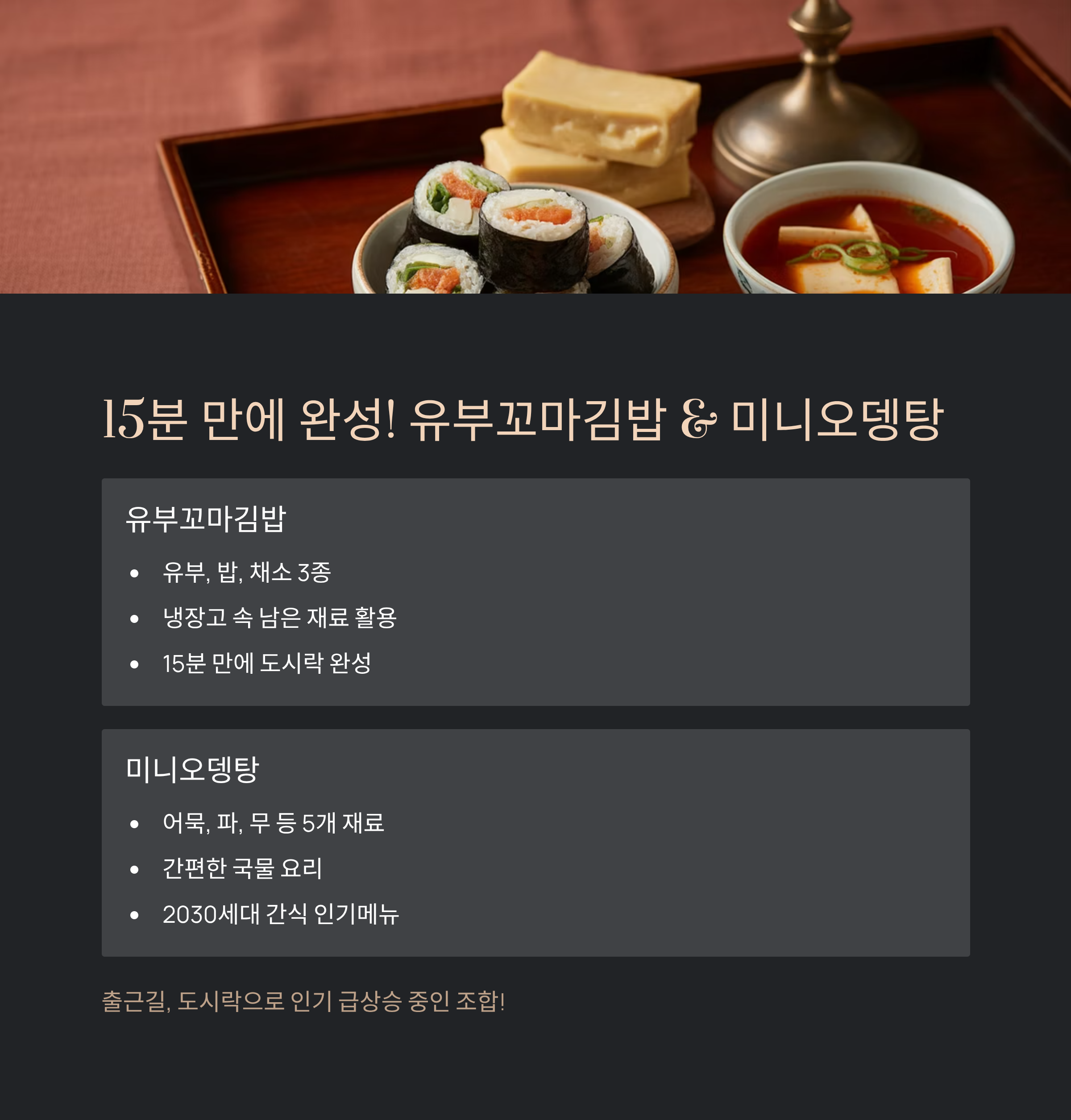 | 유부꼬마김밥 | 밥, 유부, 김 | 15분 |