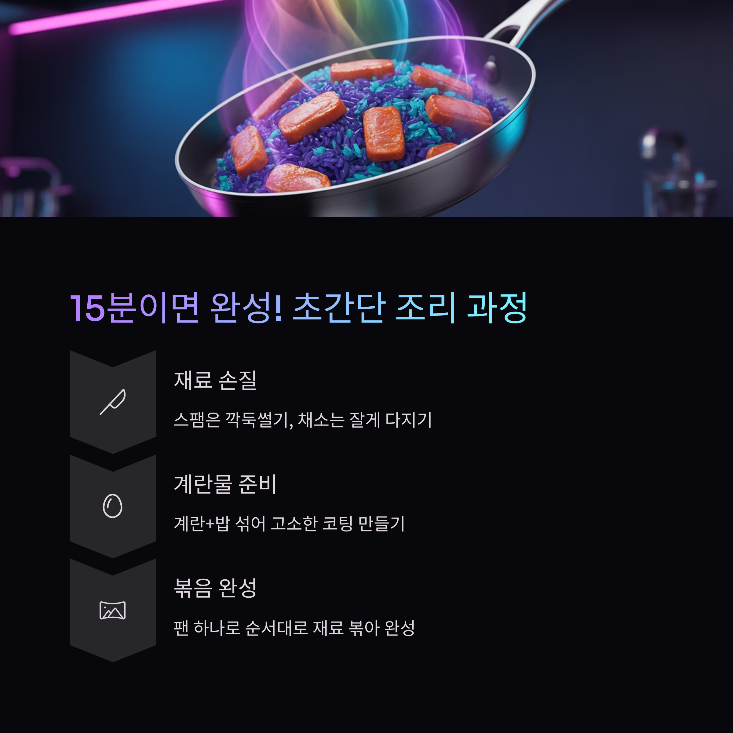 이제 준비한 재료들을 가지고 요리를 시작해봐요. 표준화된 조리과정을 이해한다면 스팸볶음밥 더 쉽게 만들 수 있답니다. 중불에서 스팸과 당근을 먼저 볶아주고, 양파를 추가해 수분이 충분히 날아가도록 해주세요. 밥과 계란물을 함께 섞어 팬에 볶아주면 맛있고 든든한 한 끼가 완성됩니다. 😊 요리 과정이 어떻게 구성되는지 한눈에 살펴볼까요?