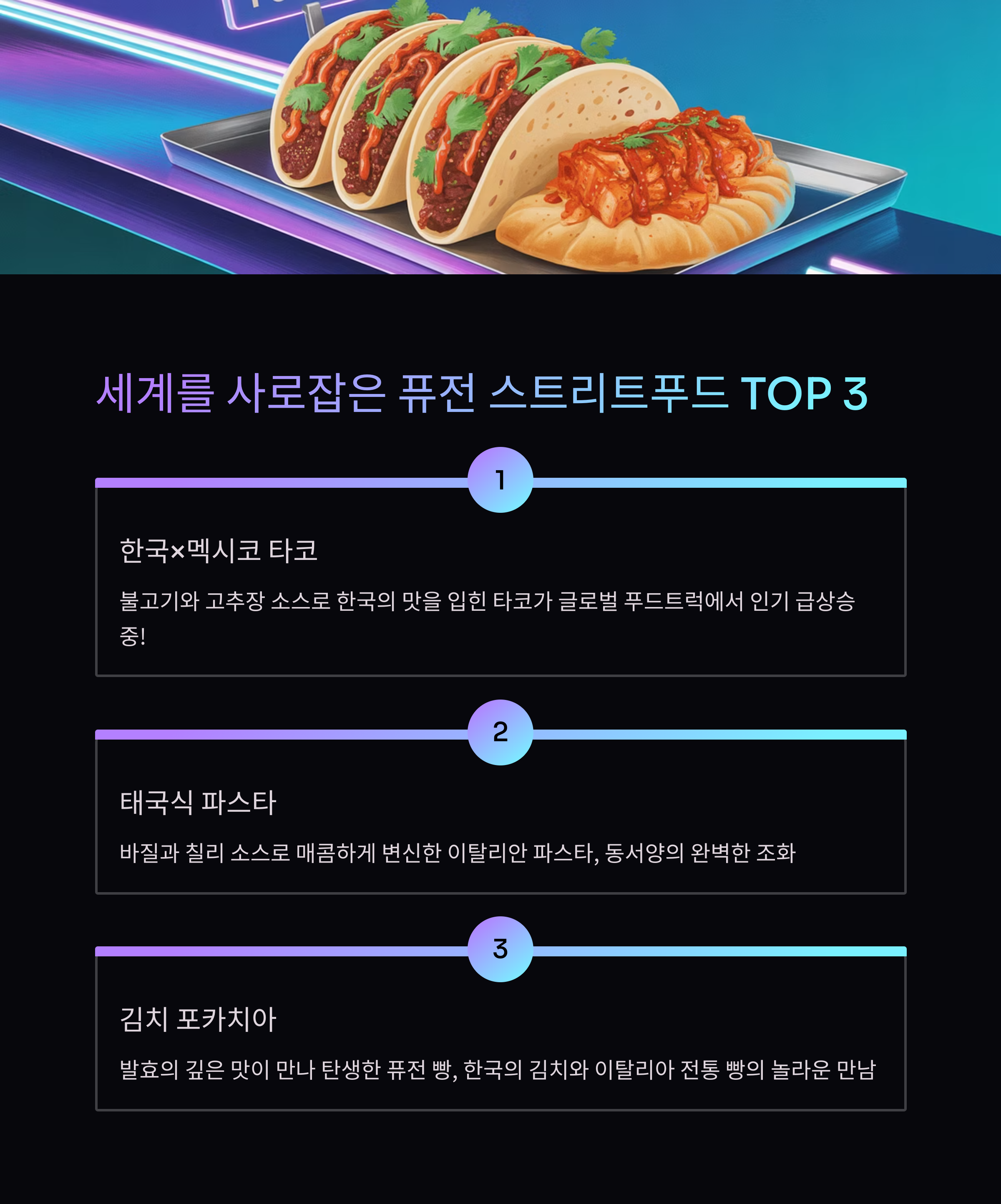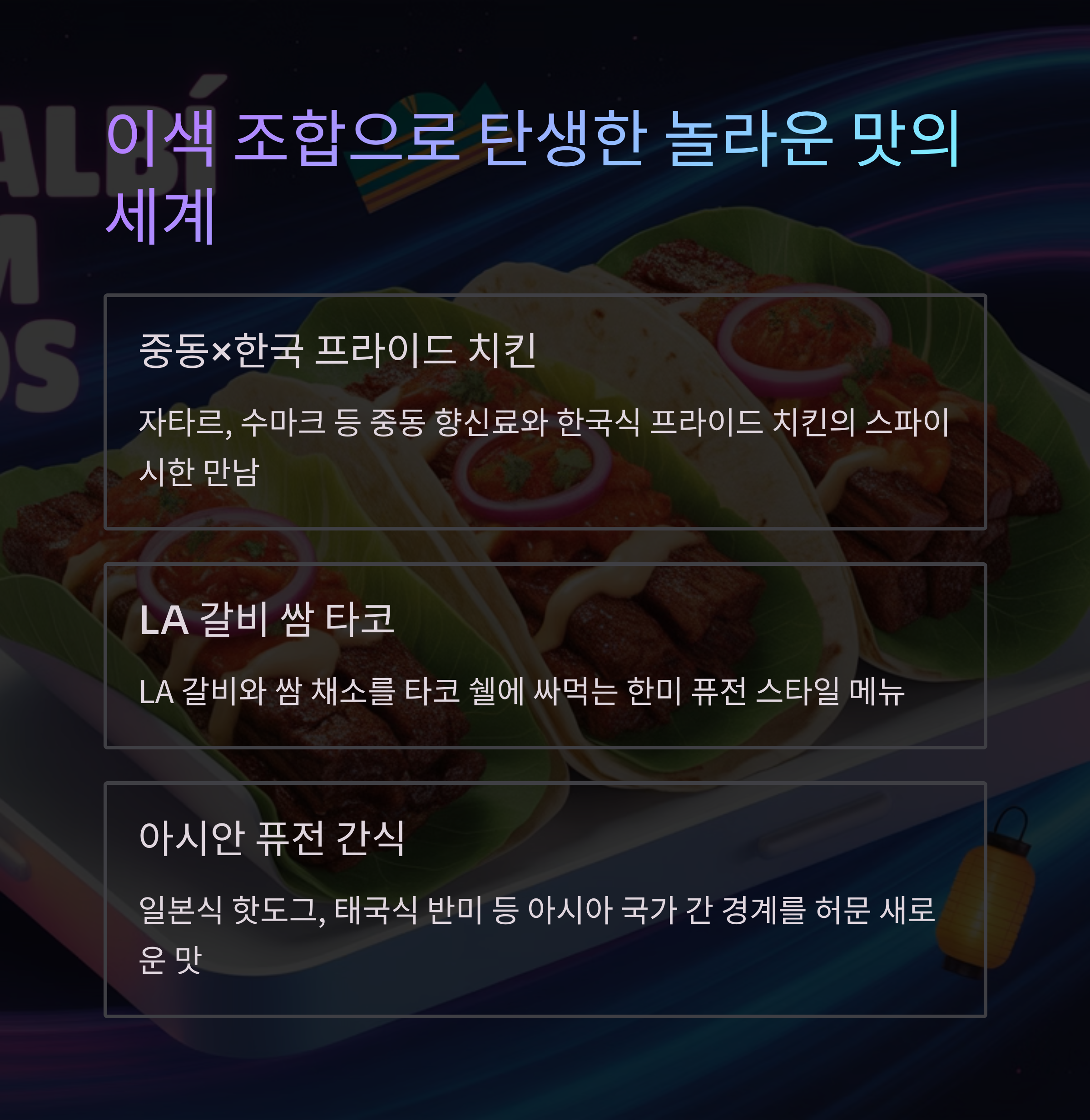 | 한국-멕시코 타코 | 불고기, 김치, 토르티야 | 매우 높음 |