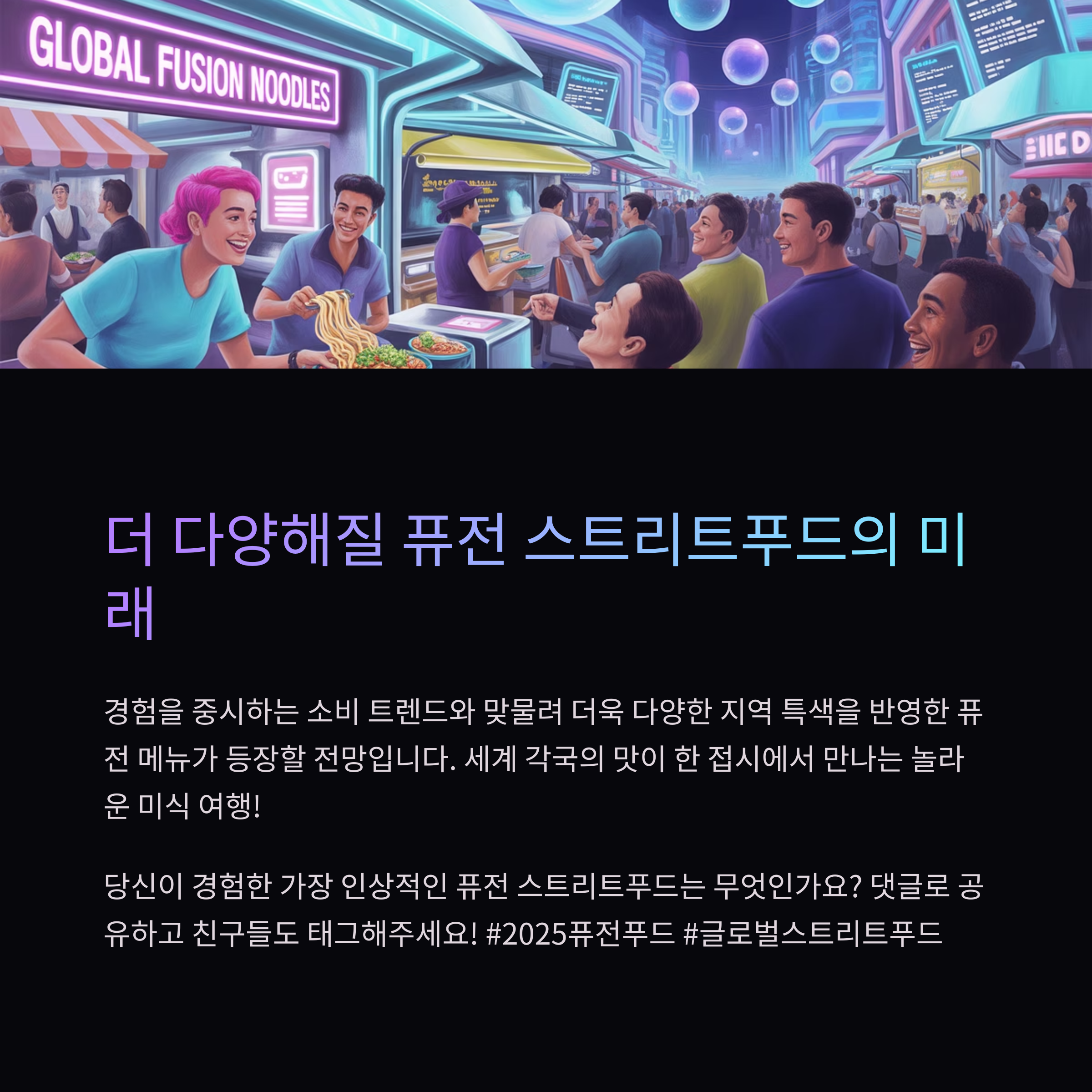 지금까지 우리는 세계적 퓨전 스트리트푸드 트렌드와 인기를 끌고 있는 대표 메뉴들을 살펴보았습니다. 다양한 문화의 융합, 건강과 지속 가능성을 고려한 혁신, 그리고 SNS를 통한 급속한 확산은 이들 음식을 더욱 매력적으로 만들고 있습니다. 이러한 변화는 소비자에게 새로운 미식 경험을 제공하며, 전 세계 스트리트푸드 산업에 긍정적인 영향을 미칩니다. 퓨전 스트리트푸드는 이제 단순한 음식 이상의 의미를 가지며, 다양한 문화적 교류와 지속 가능성의 메시지를 전달합니다.