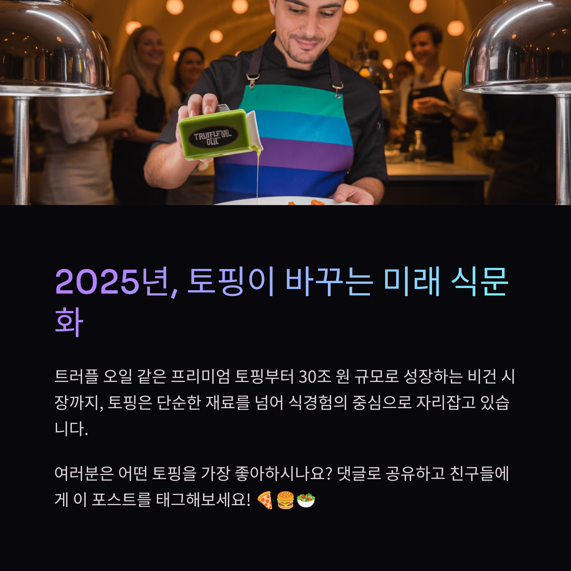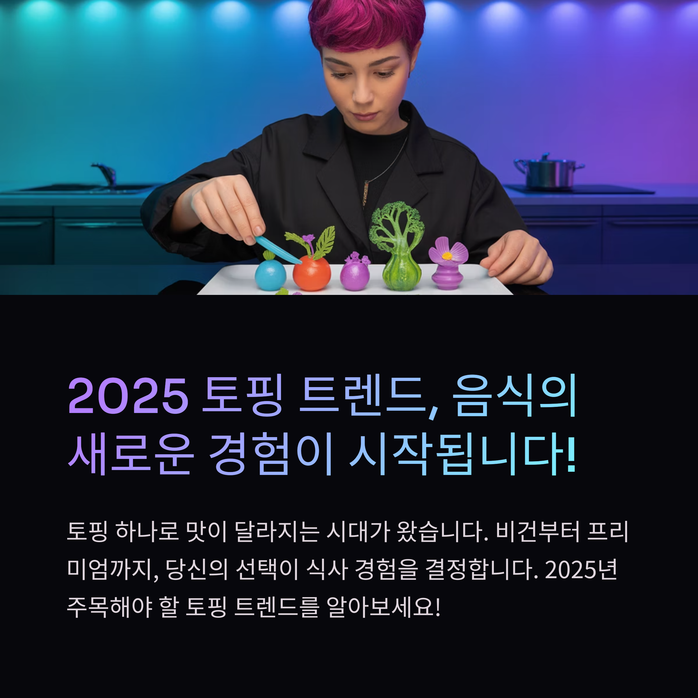 토핑의 다양성은 우리의 식문화를 더욱 풍부하게 만들어 줍니다. 각종 요리에 자신만의 개성을 담아내는 토핑의 세계를 탐험하지 않을 수 없습니다. 피자부터 핫도그에 이르기까지, 다양한 선택지를 통해 우리의 미각을 만족시킬 수 있습니다. 이러한 정보를 통해 계속해서 새롭고 독창적인 요리를 창조해 가길 바랍니다. 이것이 언제나네가 제공하는 또 하나의 특별한 경험입니다.