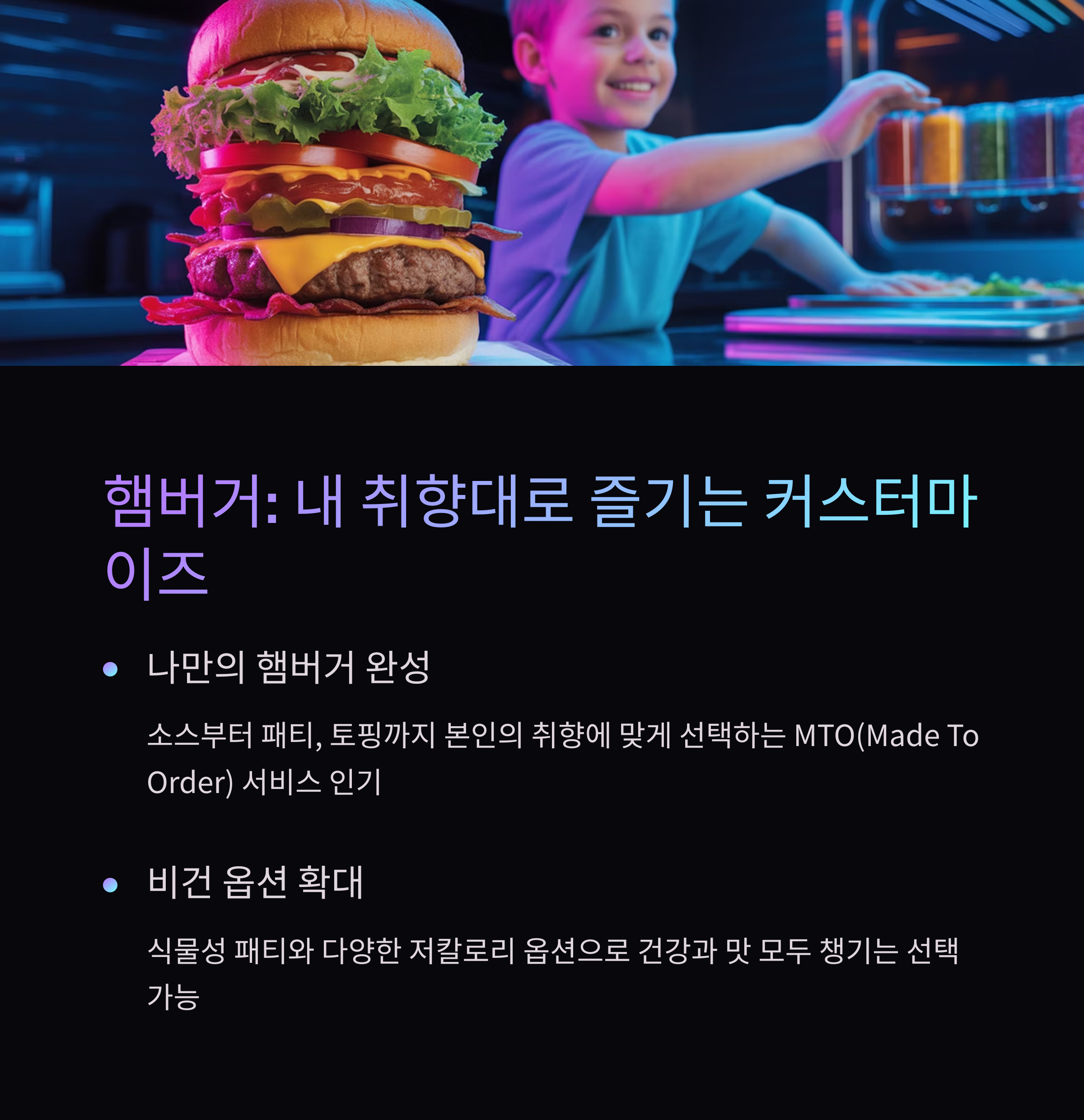 햄버거는 누구나 좋아하는 메뉴 중 하나로, 맛의 다양함으로 인기를 끌고 있죠. 최근 커스터마이징 트렌드가 떠오르면서, 다양한 토핑으로 자신만의 햄버거를 만드는 것이 인기입니다. 신선한 채소, 베이컨, 소스 등을 조합해 색다른 맛을 경험할 수 있어요. 소스 중에서도 특히 스위시(달콤·매운) 소스가 인기인데요, 이 소스는 젊은 층에서 53% 이상 선호하는 것으로 나타났습니다. 🤤 또한, 비건 토핑의 인기가 급상승 중입니다. 식물성 패티를 통해 건강을 생각하는 소비자들이 늘어나고 있어요.