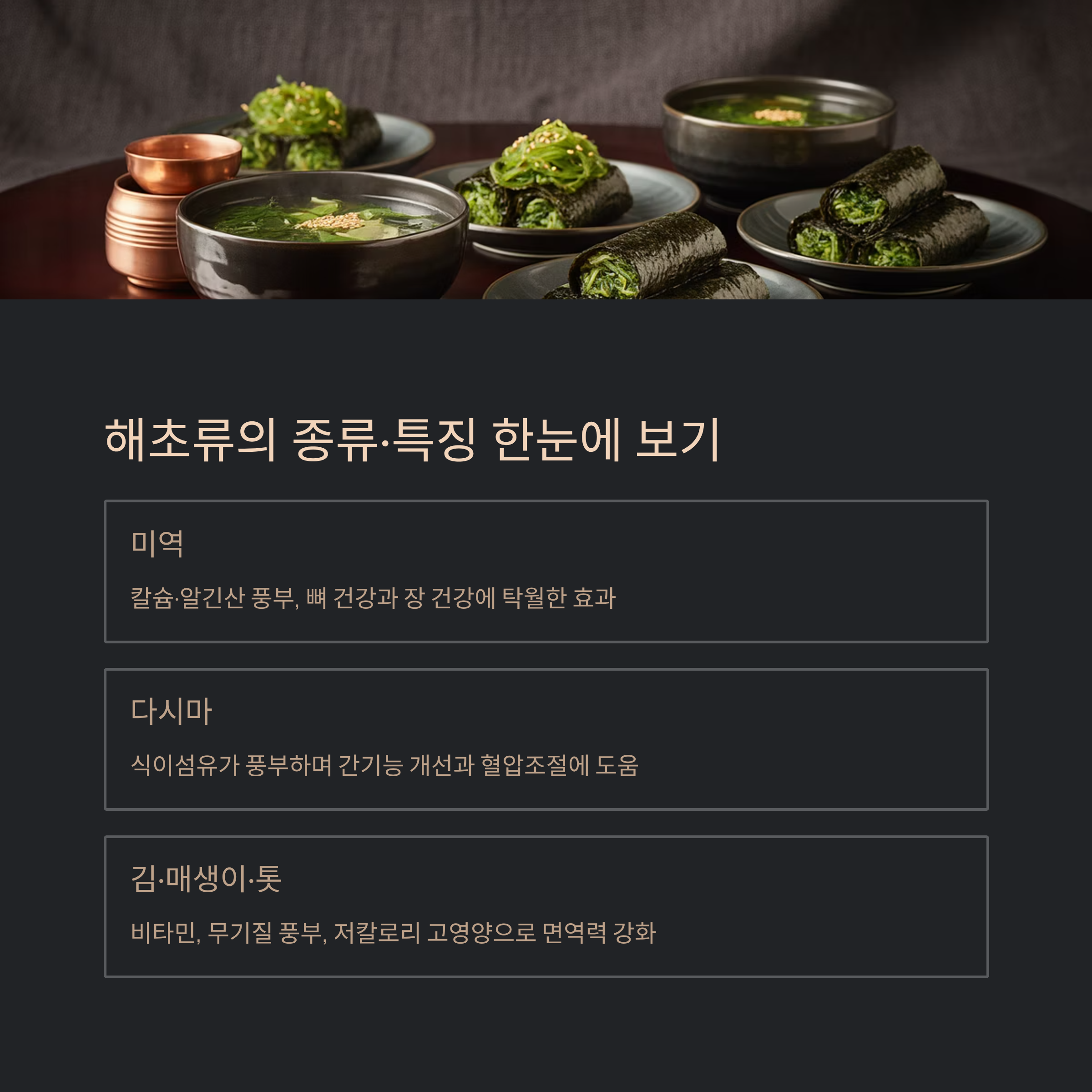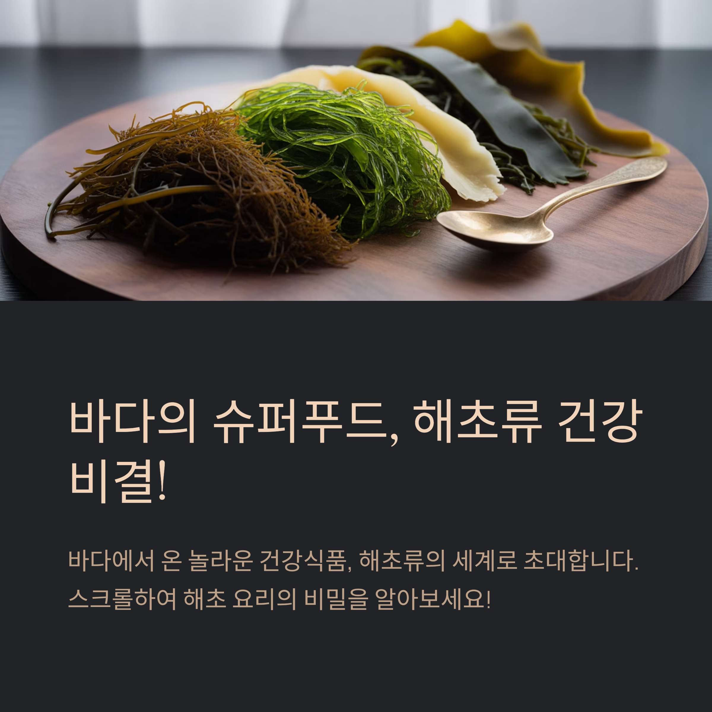 소화 건강에 특히 좋아요. 요즘엔 영양 데이터도 쉽게 검색할 수 있어서, 알맞은 섭취량을 쉽게 관리할 수 있어 오! 해초류에 대해 좀 더 알아볼까요?