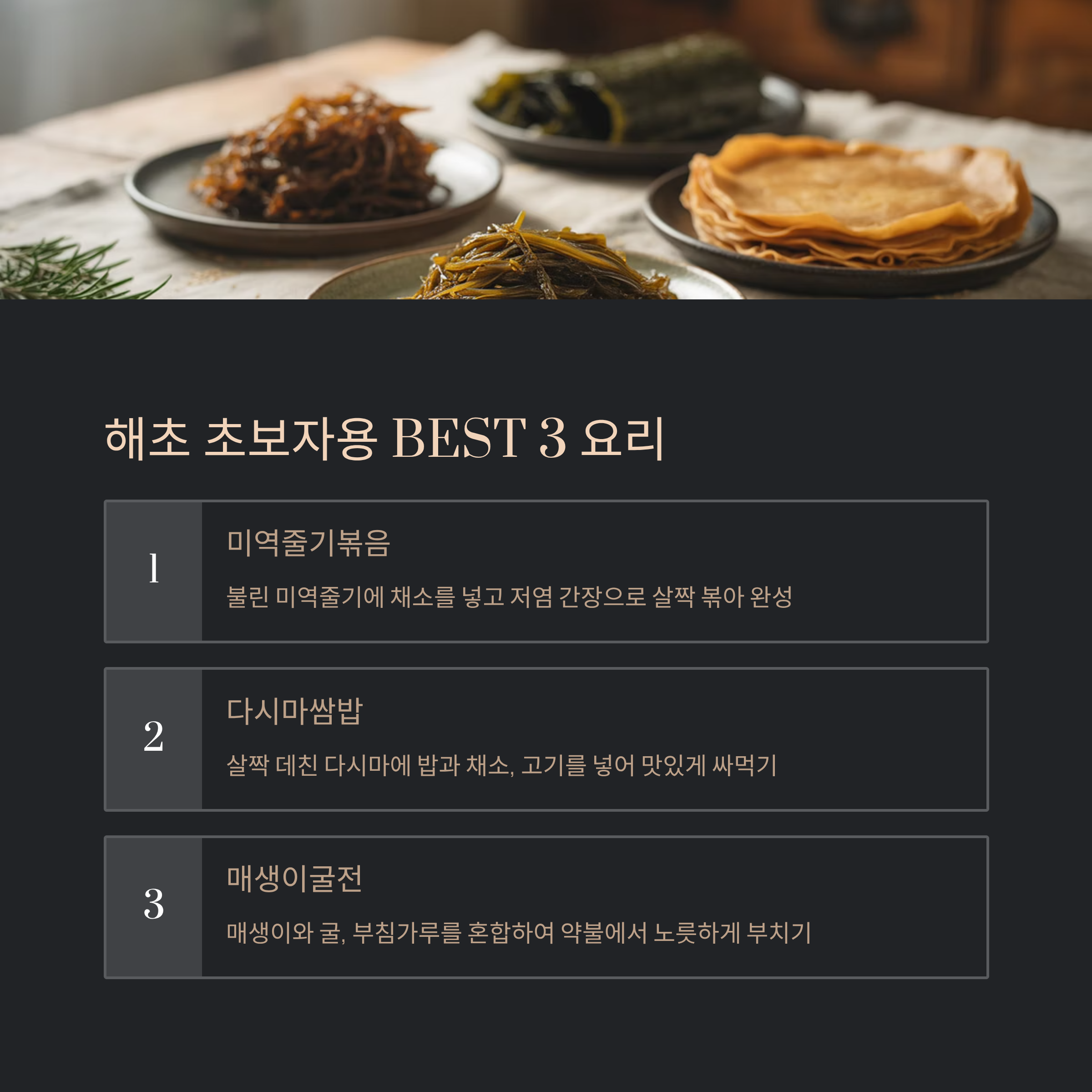 미역줄기볶음이나 다시마구이는 아주 간편해요. 진행하다 보면, 어느새 자신감이 붙을 거예요. 이런 것들만 기억해두세요!