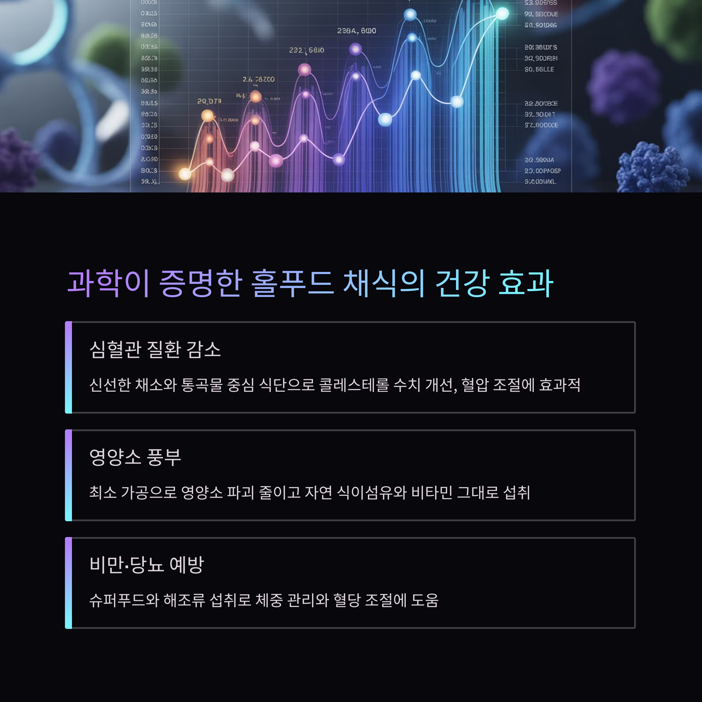 이제는 수치로 증명된 홀푸드 채식의 건강 효과를 살펴볼까요? 수많은 연구가 채식주의자의 건강 상태가 상당히 좋다는 것을 밝혀주고 있답니다. 특히 심혈관 질환과 당뇨병, 비만 예방에서 뛰어난 효과를 보이고 있어요. 각종 데이터와 연구 결과로 확인할 수 있습니다.