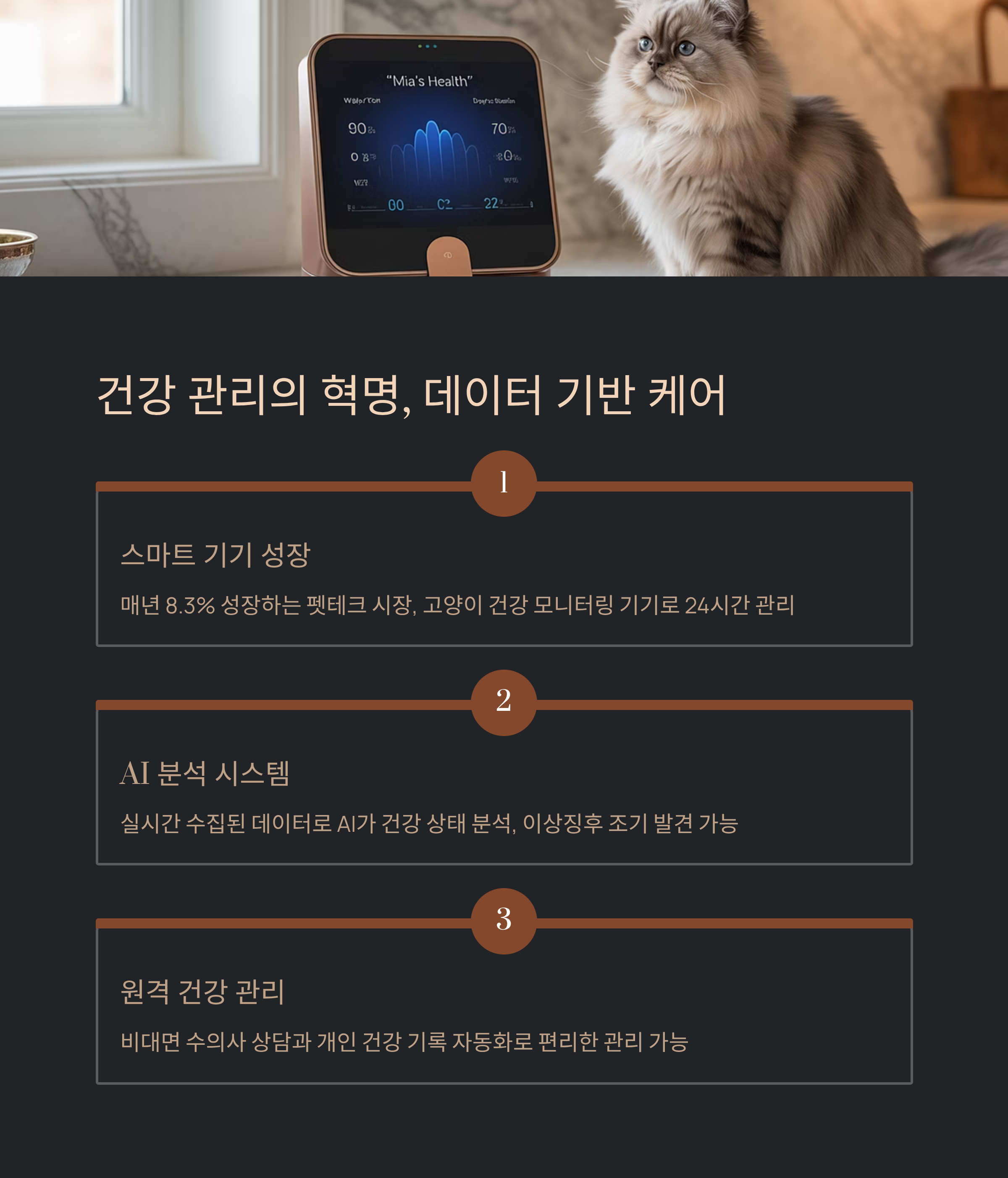 2025년을 맞이하며, 고양이 돌봄 분야에서도 데이터 기반 관리가 주류로 자리잡고 있어요. 스마트 기기의 발달과 함께 GPS, 심박수, 활동량을 측정하는 스마트 목걸이와 AI 급식기, 자동 물 급여기 등의 기기를 통해 집사님들은 고양이의 상태를 보다 쉽게 파악하고 관리할 수 있게 되었답니다. 🙌 이를 통해 몸무게 변화나 활동량 감소 같은 미세한 신호도 빠르게 포착하여 조기에 대응할 수 있습니다. 특이하게도, 최근의 펫테크 기기의 보급률이 30%를 초과했으며, 원격 수의 상담 서비스의 사용도 두 배 이상 증가했어요. 이를 통해 고양이의 행동과 건강 상태에 대한 실시간 모니터링과 조기 경보 기능을 활용할 수 있죠. 아래 표를 통해 다양한 기능과 그에 따른 장점을 한눈에 확인해 보세요.
